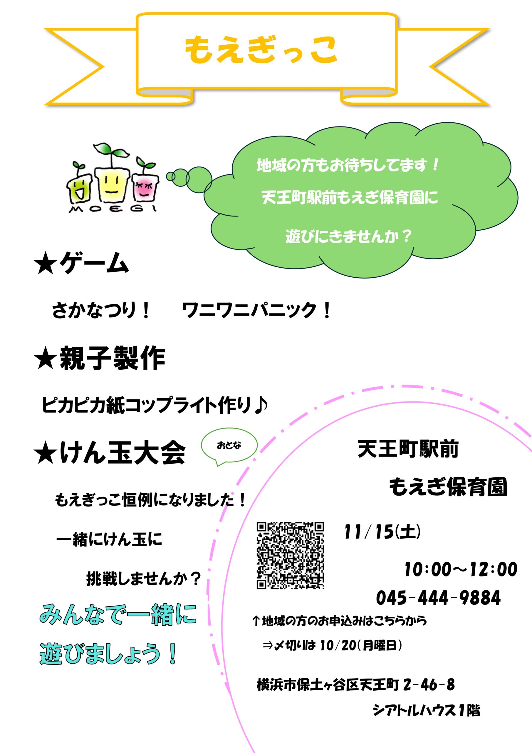 11/15(土)地域育児支援「もえぎっこ」天王町駅前もえぎ保育園で開催します!